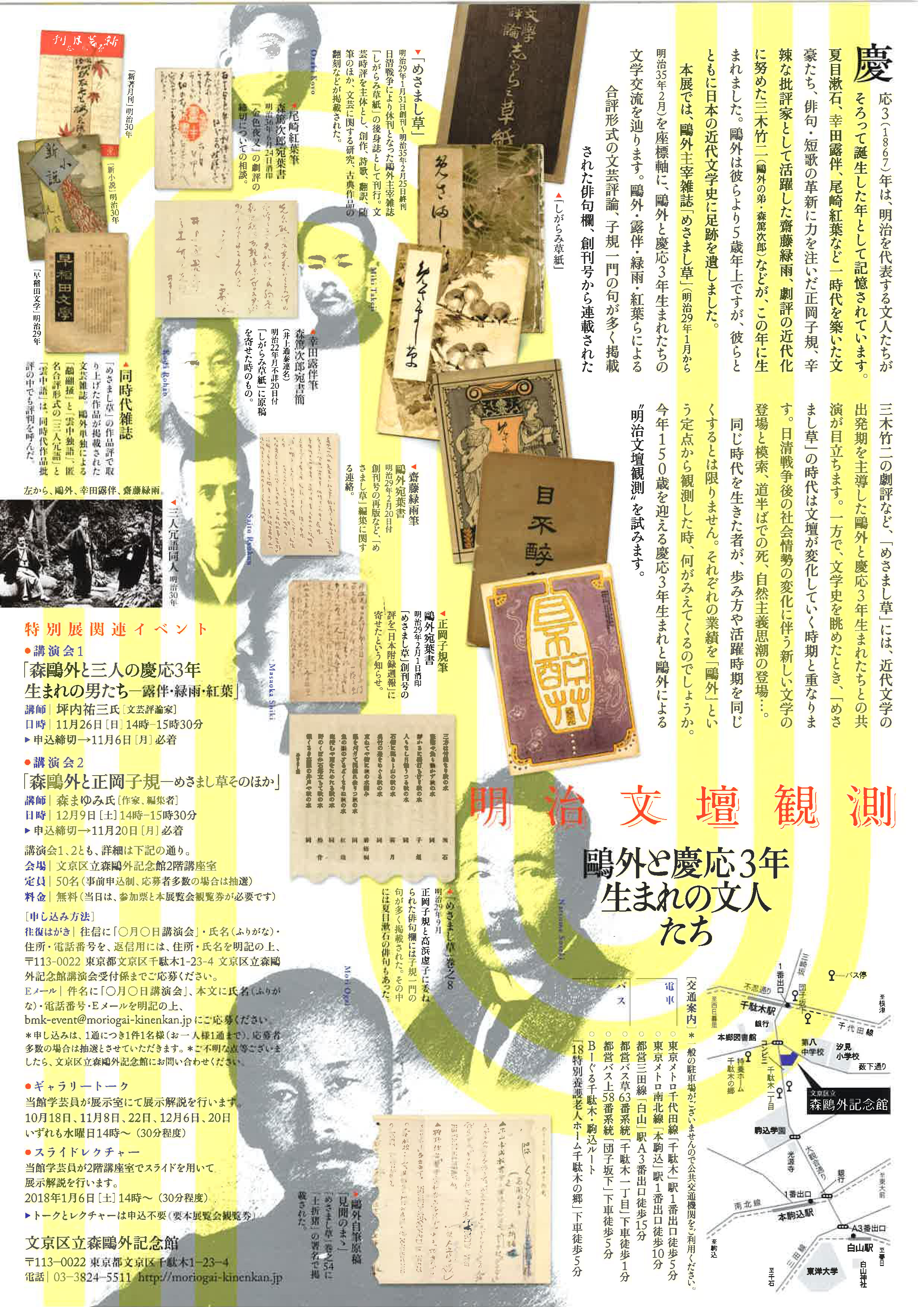 慶応3年から150年目にあたる本年は、近代文学を彩る文人たちが生まれた年です。鴎外は彼らより5歳年上ですがともに文学を模索し交流を深めました。展覧会では、鴎外の主宰雑誌「めさまし草」を基軸に、明治30年代の文壇の状況と彼らの交流を紹介します。