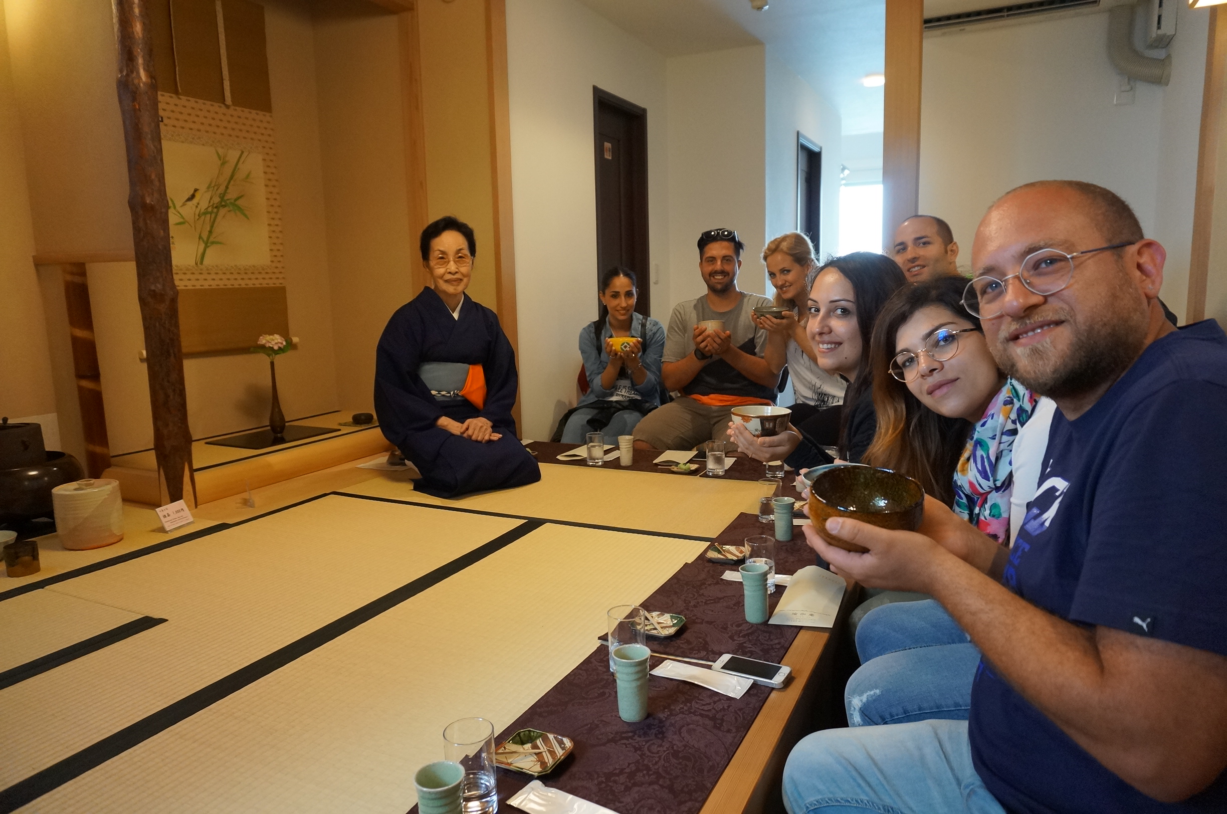 椅子とテーブルと言う現代的な空間でのお客様としてのお抹茶の頂き方を無...