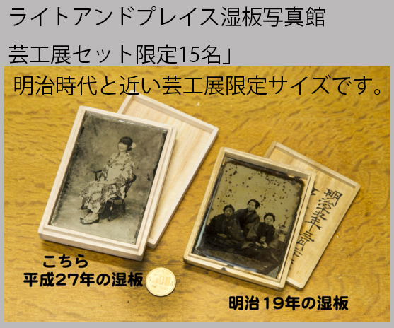 龍馬も撮影したガラス写真技法を再現したライトアンドプレイス湿板写真館は、2つのイベントとタイアップで今年も芸工展だけの特別セット[限定15組]を販売します。 これは、明治時代のサイズを意識した小さいも...